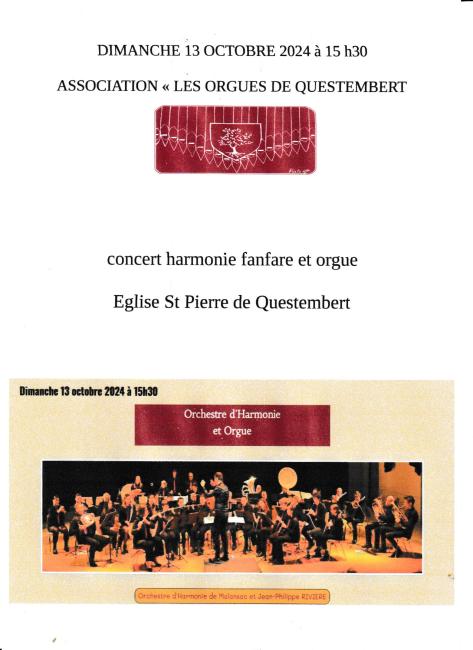 Pour ce concert exceptionnel l'orgue jouera avec l'orchestre harmonie fanfare de Questembert, dans un programme allant de Hans Zimmer ( Da Vinci Code) au répertoire contemporain en passant par JS Bach , Charles Gounod et compagnie !