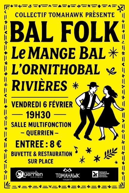 Grand Bal Folk le vendredi 6 février à la salle multifonction de Querrien. Invité exceptionnel, Le Mange Bal venant tout droit de Paris avec son accordéon et ses machines pour nous présenter un répertoire folk jeune et dynamique aux sonorités électroniques qui ne laissent pas indifférent, l’avenir de la musique folk est bel est bien la.