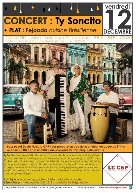 Pour sa soirée de Noël, le CAP vous propose un peu de la chaleur au cœur de l’hiver, avec un concert de salsa cubaine (prix libre) et un dîner aux couleurs de l’Amérique du Sud (8e). Lieu : café associatif de Pancé
