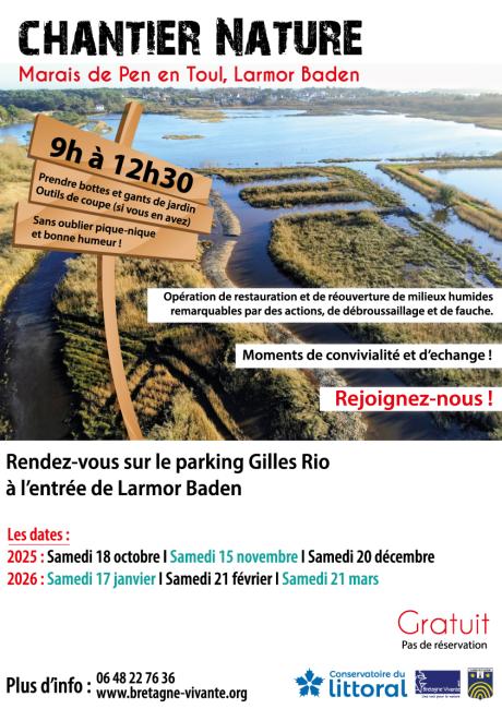 Les chantiers nature de Pen-en-Toul à Larmor-Baden auront lieu le 3e samedi du mois, de septembre à mars. Le développement des haies, fourrés ou friches est la source de l’érosion de la diversité floristique et faunistique des prairies. Ils réduisent aussi la visibilité sur les marais pour le public et favorisent la présence des prédateurs (renards, corneilles…) ce qui perturbe la reproduction des oiseaux.
