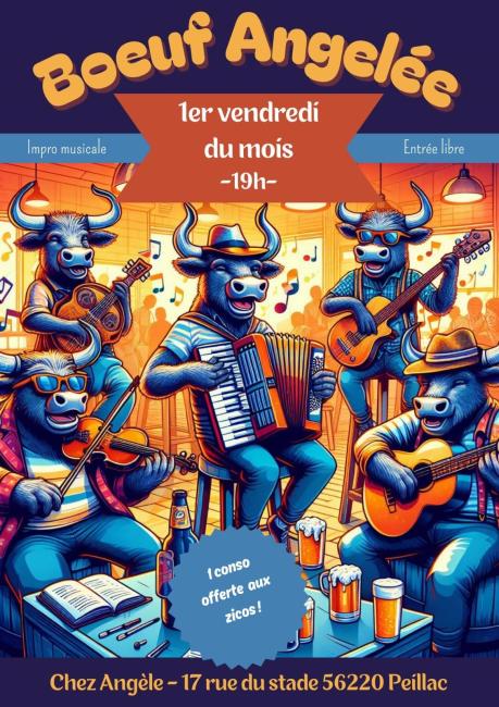 Soirée « Bœuf angelée » Bœuf musical, Comme chaque premier vendredi du mois, les musiciens, chanteurs motivés et inspirés se retrouvent dans le bar pour une joyeuse soirée. Apportez vos instruments et vos chansons.