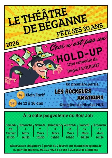Théâtre "Ceci n'est pas un HOLD-UP" une comédie de Régis Le Guigot et en première partie "Les rockeurs amateurs" une pièce de Nicolas Nué. A la salle polyvalente du BOIS JOLI.
