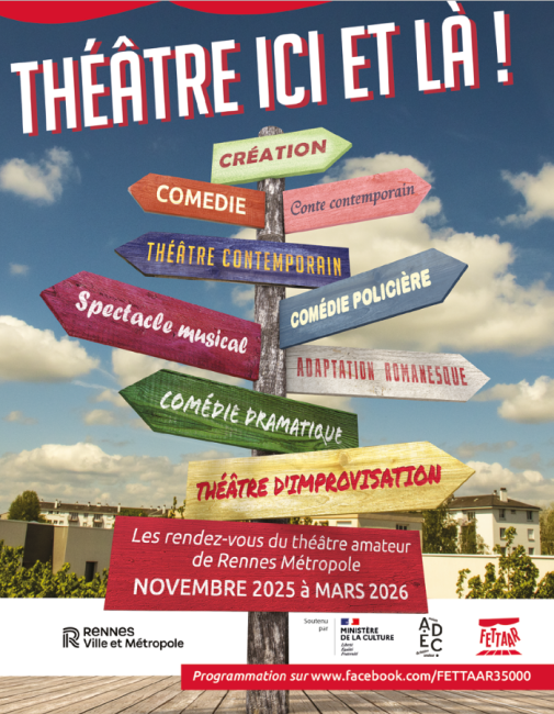 Festival Théâtre ici et là, programmation théâtrale du réseau rennais. Gratuit pour les moins de 8 ans, 2 € pour les moins de 18 ans, les étudiants et les titulaires de la carte Sortir ! 5 € tout public