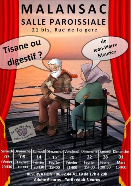 Tisane ou digestif de Jean Pierre Mourice. Piece en trois actes. "Deux couples, une petite vie calme et tranquille trop calme. Mais grâce à la rencontre du ''détenteur ''officiel de l'élixir de jouvence tous les espoirs sont enfin permis. Les deux vieux amis découvrent la potion magique qui les rajeunit d'un coup et leur donne une nouvelle soif de vivre ! Cela inquiète leurs épouses et encore plus leurs enfants."